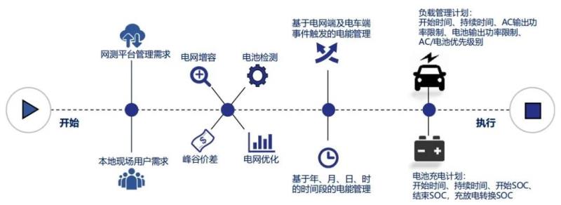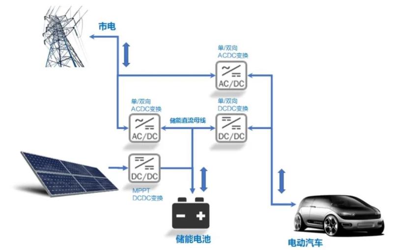 市電通過雙向AC/DC模塊給電動汽車充電,同時電動汽車的能量也可以逆變反饋給電網(wǎng),實現(xiàn)V2G;用電低谷時市電通過雙向AC/DC模塊給儲能電池充電,用電高峰期儲能電池則并網(wǎng)放電,實現(xiàn)削峰填谷;白天光伏組件通過DC/DC模塊給儲能電池充電,實現(xiàn)綠色能源的接入;儲能電池可以通過雙向DC/DC給電動汽車充電,彌補市電容量的不足,減輕大功率充電對電網(wǎng)的壓力,同時電動汽車也可將動力電池的電能回饋給儲能電池存儲。