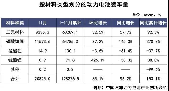 就在大家以為磷酸鐵鋰日薄西山的時候,它卻突然在2021年迎來了逆襲。根據(jù)中國汽車動力電池產(chǎn)業(yè)創(chuàng)新聯(lián)盟的數(shù)據(jù),2021年1—11月,磷酸鐵鋰電池累計裝車量是64.8GWh,占到總裝車量的50.5%,超越了三元鋰電池。