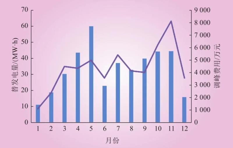 截至2019年年底,西北省間調(diào)峰輔助服務市場有償調(diào)峰交易6230筆,調(diào)峰電量40.26億kW·h,調(diào)峰費用共計52621.65萬元。除此之外,啟停調(diào)峰9臺次,合計費用1080萬元。虛擬儲能目前以甘肅蘭鋁電廠為試點,總計調(diào)峰電量2297.5 MW·h,費用11.51萬元。全年各月市場交易情況如圖3所示。相比于市場開展前,預計年度有償調(diào)峰空間為95.81億kW·h。市場開展初期,有償調(diào)峰交易電量占預計有償調(diào)峰空間的42%左右,說明所設計的調(diào)峰市場機制能有效促進市場主體挖掘調(diào)峰空間。