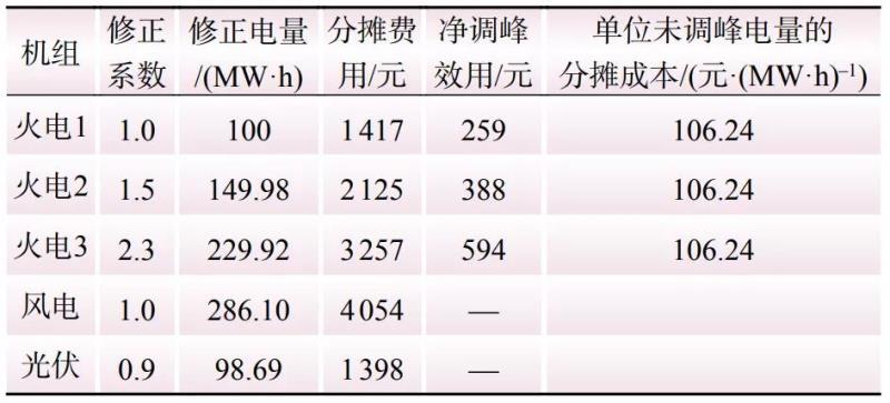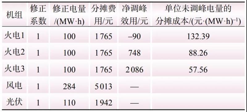 當不考慮電量修正時,即每個調(diào)峰費用分攤主體的修正系數(shù)均為1,按實際發(fā)電量分攤調(diào)峰費用,則分攤結(jié)果如表6所示。