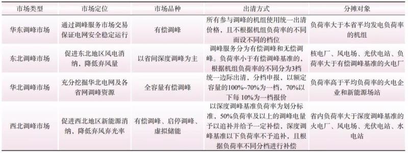 表1從市場定位、市場品種、出清方式、分攤對象對華東、東北、華北與西北調(diào)峰市場進行對比。