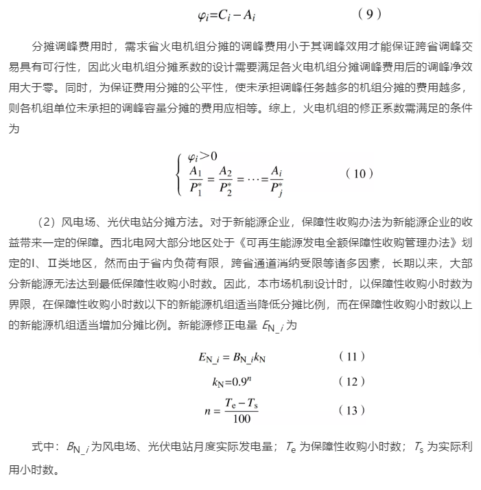 在進行市場機制設計時,一方面,要充分發(fā)揮稀缺資源的價值,必須從市場交易品種的設計以及參與方式出發(fā),為具備調(diào)峰能力的機組設計與之相適應的市場品種以及市場參與方式,充分激勵機組參與調(diào)峰市場;另一方面,從市場費用分攤來看,調(diào)峰需求省的省內(nèi)所有電源企業(yè)都有承擔電網(wǎng)調(diào)峰的義務,即跨省調(diào)峰費用應該由省內(nèi)所有機組進行分攤,各類機組的分攤方式,既要符合科學、合理的原則,又要“以分攤促消納”,從分攤角度間接激勵機組參與調(diào)峰。