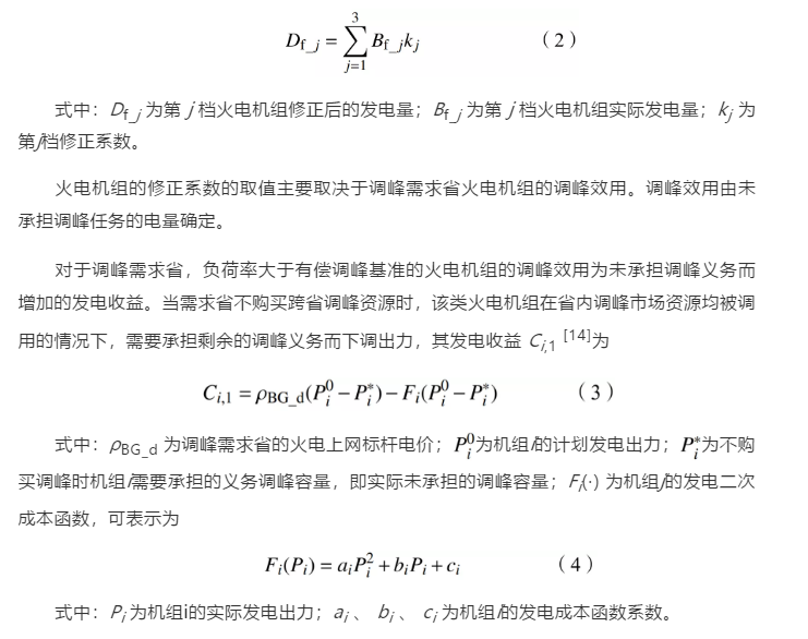 火電機組可以通過“調(diào)減出力”方式提供調(diào)峰服務。一般情況下,火電機組最小技術出力為50%負荷率,低于最小技術出力范圍時,火電機組由于燃燒不穩(wěn)等原因需要增加燃燒成本。因此,應以50%負荷率為分界點,對火電機組提供的調(diào)峰服務加以區(qū)分。另外,各省火電機組參與跨省調(diào)峰將對省內(nèi)火電機組發(fā)電量產(chǎn)生影響,需要兼顧火電機組年度基數(shù)電量合約的完成情況。