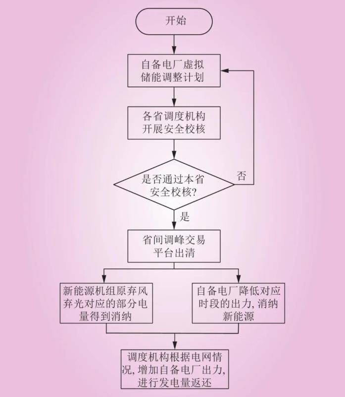 基于上述情況,在本市場設計過程中,提出虛擬儲能交易模式。虛擬儲能交易模式是在日前或更短時間維度上,通過自備電廠與新能源之間替代發(fā)電,在新能源大發(fā)時,自備電廠削減出力,而新能源發(fā)電低谷時,再多發(fā)出力,追補自備電廠計劃電量,自備電廠總電量計劃保持不變。虛擬儲能本質(zhì)上是通過自備電廠發(fā)用電計劃的“時空平移”,實現(xiàn)新能源靈活存取的儲能效果。在日前階段,自備電廠根據(jù)自身生產(chǎn)計劃以及發(fā)電預計劃,向本省(區(qū))電力調(diào)度機構提交次日虛擬儲能曲線,即帶時標的跨省可調(diào)峰電量。本省調(diào)度機構將通過安全校核的自備電廠虛擬儲能計劃提交至分中心。分中心將虛擬儲能可調(diào)峰能力與實際跨省調(diào)峰需求進行匹配出清,并將出清結(jié)果下發(fā)至各?。▍^(qū))電力調(diào)控中心。各省(區(qū))電力調(diào)控機構據(jù)此修改省內(nèi)自備電廠次日出力計劃,自備電廠按照調(diào)度下發(fā)的出力計劃進行發(fā)電。具體交易流程如圖1所示。