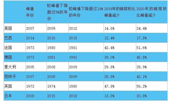 在碳達峰后直至2019年,多數(shù)典型國家平均每年碳排放減少量為峰值排放量的1%左右。法國、德國、英國在1973年碳達峰,到2019年碳排放水平較峰值下降約40%-50%。美國、日本在2007年、2008年碳達峰,至2019年碳排放較峰值下降14%左右。上述國家達峰后年平均排放降幅約為峰值排放量的1%左右。意大利、西班牙、巴西碳達峰后排放量降幅較快,達峰后至2019年年平均降幅為峰值排放量的2%左右。