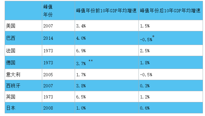 注:*巴西達峰年份晚,使用的是峰值年份后5年GDP年均增速。**由于數(shù)據(jù)原因,德國使用的是峰值年份前2年GDP年均增速。