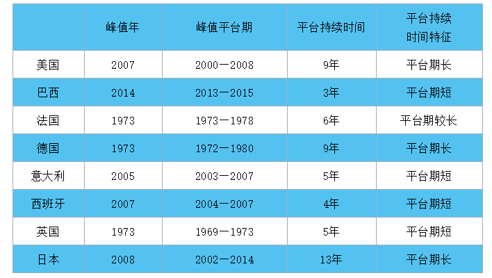 一般來說,達峰會伴有一定時間的平臺期。雖然絕對意義上的峰值(最高點)是在某一年份出現(xiàn),但在峰值年份前后碳排放量會呈現(xiàn)平臺波動特征。本文將峰值5%以內(nèi)的波動,即將排放在峰值水平95%至峰值水平100%之間的時間段視作平臺期??梢杂^察到,典型國家的平臺期持續(xù)時長是存在差異性的。