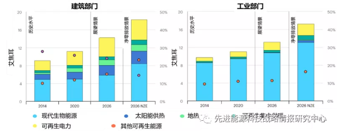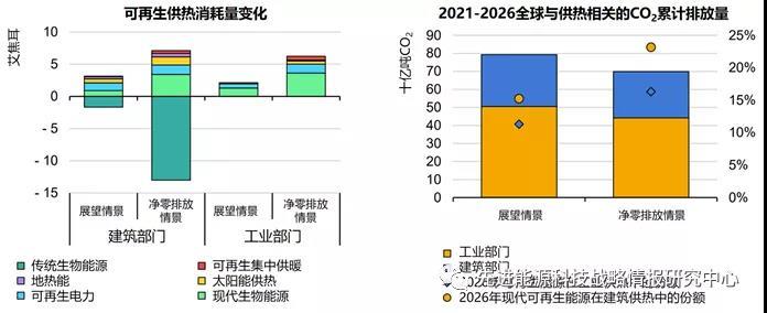圖8 至2026年建筑部門與工業(yè)部門可再生能源供熱能耗及其在供熱需求中的占比預測