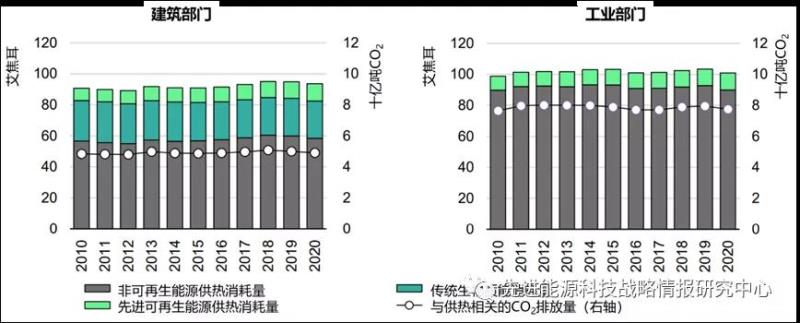 圖7 2010-2020年建筑部門與工業(yè)部門可再生和不可再生供熱能耗及相關CO2排放量