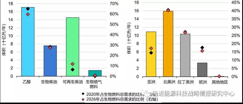 圖5 2021-2026年不同種類(左)和不同地區(qū)(右)生物燃料需求增長預測