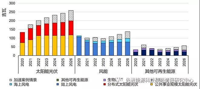 圖3 至2026年主要案例情景和加速案例情景中太陽能光伏、風能和其他可再生能源年度新增裝機規(guī)模預測