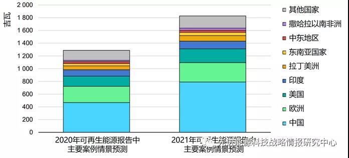 圖2 2020和2021年報告主要案例情景對未來五年不同國家/地區(qū)可再生電力裝機容量預測