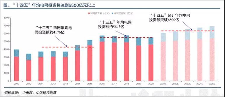 南方電網(wǎng)在“十四五”期間的計(jì)劃是總投約6700億元,較“十三五”總投資增長(zhǎng)約22%。兩者合計(jì)總投資就高達(dá)2.9萬(wàn)億元,如果算上地區(qū)電網(wǎng)公司,“十四五”期間全國(guó)電網(wǎng)總投資預(yù)計(jì)達(dá)到3萬(wàn)億元。