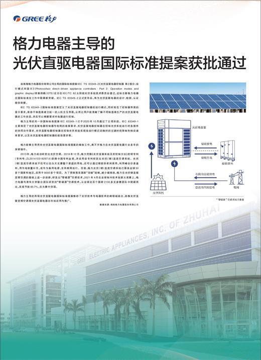 中國儲能網(wǎng)訊:由珠海格力電器股份有限公司主導(dǎo)的國際標準提案IEC TS 63349-2《光伏直驅(qū)電器控制器 第2部分:運行模式和顯示》(Photovoltaic direct-driven appliance controllers–Part 2: Operation modes and graphic display)草案終稿(DTS)近日在IEC/TC 82太陽能光伏系統(tǒng)技術(shù)委員會通過,這標志著格力電器在國際標準化工作中取得新突破。