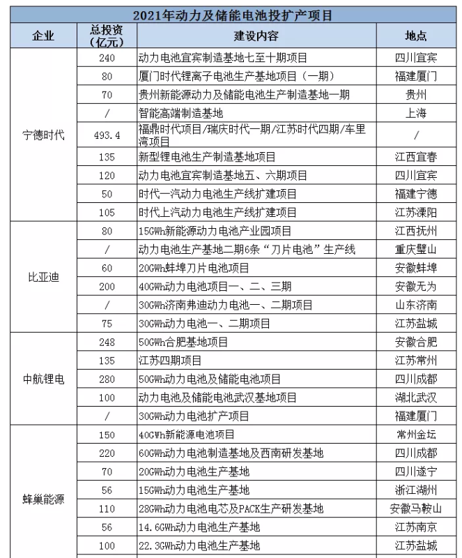 以下為2021年中國動(dòng)力電池投擴(kuò)產(chǎn)回顧: