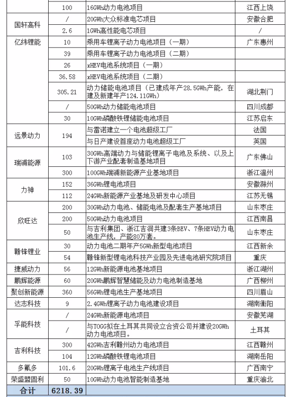 高工鋰電據(jù)不完全統(tǒng)計(jì),2021年動(dòng)力電池投擴(kuò)項(xiàng)目63個(gè)(含募投項(xiàng)目),投資總額超6218億元,規(guī)劃新增產(chǎn)能超過2.5TWh。