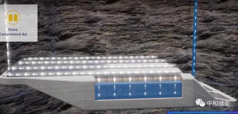當(dāng)需要發(fā)電時(shí),將水庫里的水灌入地下巖石空間,將儲存在里面的壓縮空氣擠出地面,進(jìn)入到壓縮機(jī)里膨脹做功發(fā)電。