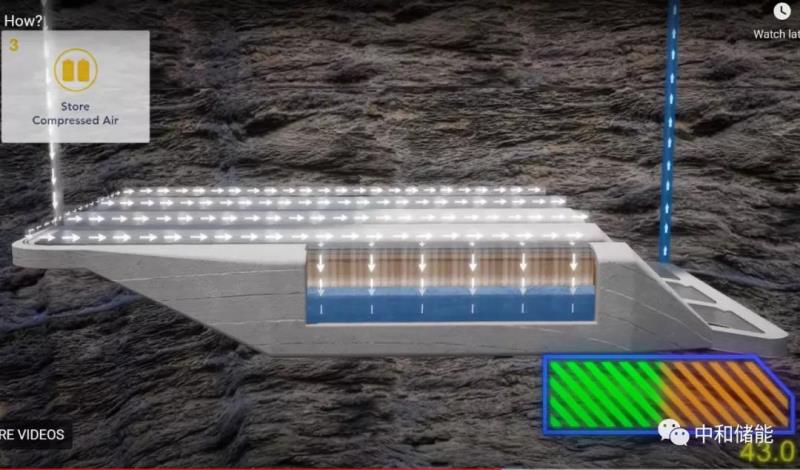 由于熱力學(xué)原因,氣體被壓縮后溫度會升高,在儲存過程中熱量擴(kuò)散到周圍物體,溫度就會逐漸恢復(fù)常溫,那么這些損失的熱量就是導(dǎo)致壓縮空氣技術(shù)循環(huán)效率不高的原因。傳統(tǒng)壓縮空氣技術(shù)如果不保存熱量的話,其理論循環(huán)效率不會超過50%。Hydrostor公司將這些高溫氣體與水發(fā)生熱交換,把熱量存儲在水里,等后面釋放壓縮氣體來發(fā)電時(shí)再將熱量返還給氣體,以此減少損失的能量,從而提高系統(tǒng)循環(huán)效率到65%。