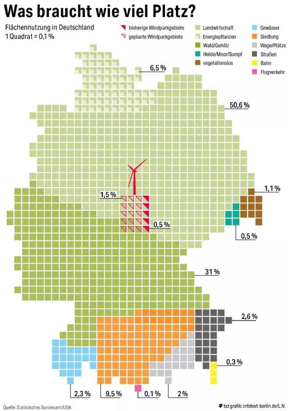 據(jù)德國(guó)“陸地風(fēng)能機(jī)構(gòu)”估計(jì),現(xiàn)代風(fēng)電場(chǎng)每平方公里大約可安裝五個(gè)風(fēng)力渦輪機(jī),只有 2% 到 3% 的面積實(shí)際實(shí)際上被風(fēng)機(jī)占據(jù);其余的風(fēng)電場(chǎng)區(qū)域可以繼續(xù)使用農(nóng)業(yè)或森林。因此未來(lái)德國(guó)實(shí)際上只需大約 0.05% 的國(guó)土面積實(shí)現(xiàn)氣候中和。