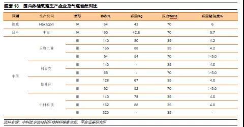從國(guó)內(nèi)主要高壓儲(chǔ)氫瓶生產(chǎn)企業(yè)生產(chǎn)的III型儲(chǔ)氫瓶與國(guó)外IV型瓶性能對(duì)比來看,IV型瓶質(zhì)量輕且儲(chǔ)氫密度高。同等體積下,壓力越大儲(chǔ)氫量越高,車輛行駛里程就更遠(yuǎn)。根據(jù)《汽車產(chǎn)業(yè)中長(zhǎng)期發(fā)展規(guī)劃》,短期內(nèi)國(guó)內(nèi)儲(chǔ)氫技術(shù)仍然會(huì)以高壓儲(chǔ)氫為主。