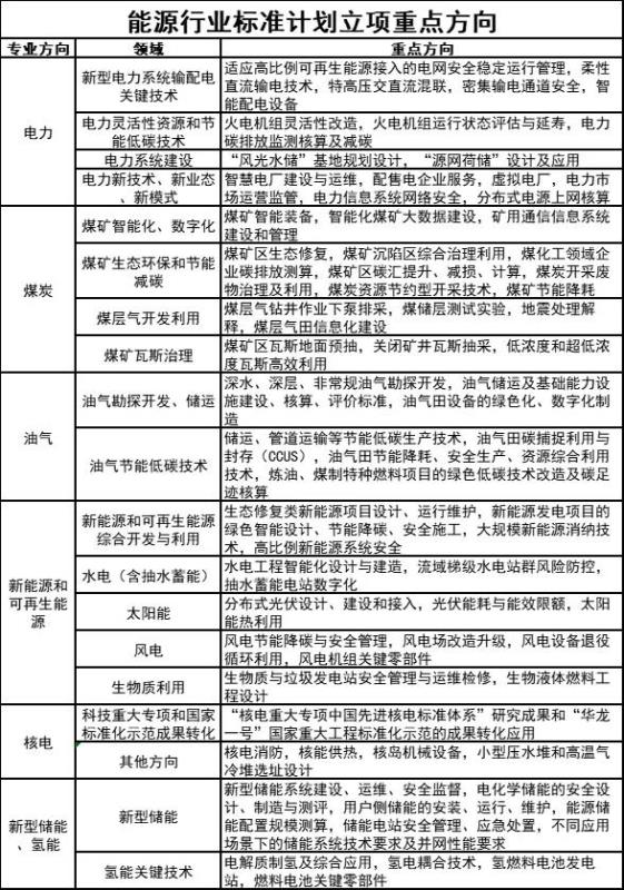 與相關國家標準的實施相配套的行業(yè)標準計劃;涉及能源領域節(jié)能、節(jié)水、資源綜合利用、環(huán)境和生態(tài)保護、綠色發(fā)展的行業(yè)標準計劃;支撐能源領域碳達峰、碳中和目標的行業(yè)標準計劃;顯著提升能源行業(yè)整體技術水平和產(chǎn)品、服務質(zhì)量的行業(yè)標準計劃;對標國外、國際先進標準,有利于提升中國標準國際公信力、影響力的行業(yè)標準計劃(各專業(yè)領域重點方向見附件)。