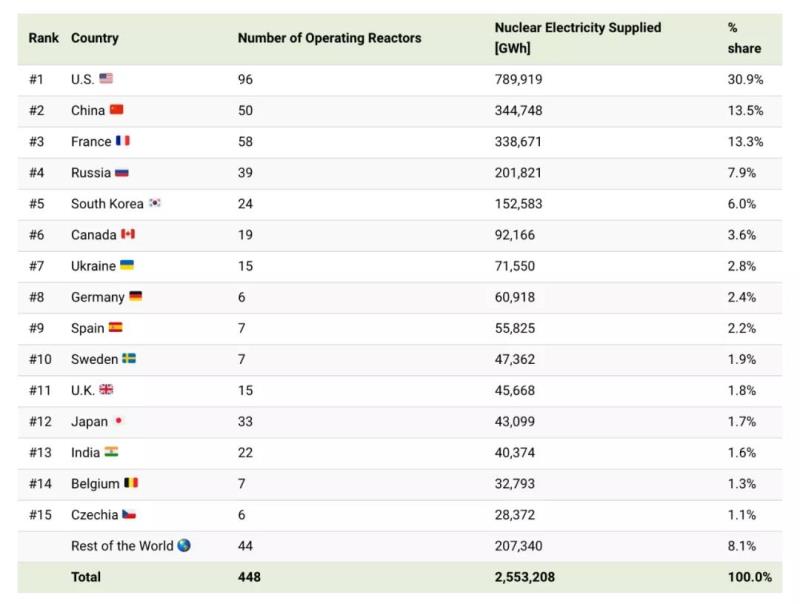 有趣的是,從絕對值來看,這些國家中只有少數(shù)躋身于世界前列。例如斯洛伐克,核能占電力結(jié)構(gòu)的53.6%,但該國的四個反應(yīng)堆占全球總運(yùn)行容量的不到1%。另一方面,盡管2020年美國的核電產(chǎn)量占全球核電產(chǎn)量的31%,但美國在核電總量中所占的份額卻排在第17位。這種差異很大程度上是由于面積和人口造成的。歐洲國家比美國和中國等大國小得多,總的來說發(fā)電量也少。