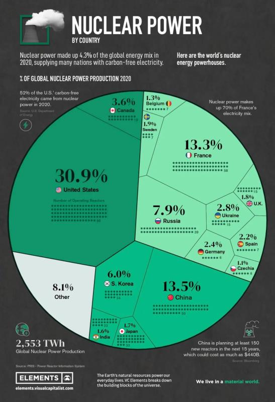 在美國,核能占全國無碳清潔電力的50%以上。此外,2020年,美國96個運(yùn)行中的反應(yīng)堆中有88個獲得了延長20年壽命的批準(zhǔn)。作為世界第二大核電生產(chǎn)國,中國正在進(jìn)一步投資核能,以實現(xiàn)其氣候目標(biāo)。該計劃包括到2035年建造150座新機(jī)組,可能耗資4400億美元。