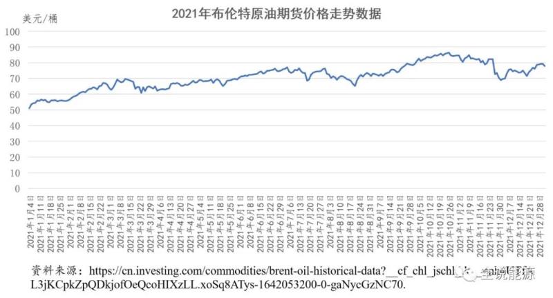 相比于天然氣和煤炭,作為大宗商品之王的原油,2021年的表現(xiàn)顯得非常溫和。1月4日,布倫特原油期貨以每桶51.50美元開盤,12月31日以每桶77.78美元收盤,2021年每桶上漲了26.28美元,上漲了1.51倍;布倫特原油的最高價,出現(xiàn)在2021年10月25日,為86.70美元/桶,比1月4日的開盤價上漲了35.2美元,上漲了1.68倍;高低價出現(xiàn)在1月4日,為每桶50.56美元,高低價差為每桶36.14美元。2021年,布倫特原油期貨均價為每桶70.95美元。
