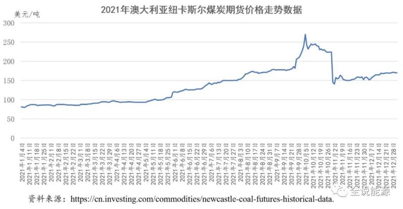 澳大利亞紐卡斯爾2021年煤炭期貨價格均價為每噸136.68美元,最高價為每噸269.50美元,最低價為每噸79.30美元,高低價差達每噸190.20美元。1月4日,澳煤的開盤價為每噸82.50美元,以2021年10月5日的最高價269.50美元計算,上漲了3.27倍;以12月31日的收盤價169.90美元計算,上漲了2.06倍。