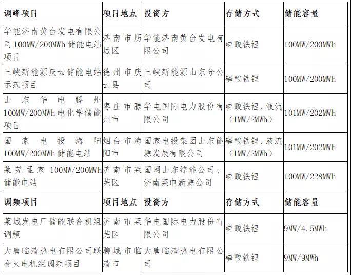 山東省在全國率先發(fā)布了省級(jí)儲(chǔ)能指導(dǎo)意見《關(guān)于開展儲(chǔ)能示范應(yīng)用的實(shí)施意見》,在實(shí)施意見中發(fā)布了儲(chǔ)能參與輔助服務(wù)、租賃給新能源場(chǎng)站、獎(jiǎng)勵(lì)優(yōu)先發(fā)電量計(jì)劃的組合政策,確定了充放電量損耗部分按工商業(yè)及其他用電單一制電價(jià)結(jié)算的方式,初步建立了盈利模式,由此帶動(dòng)了示范項(xiàng)目的建設(shè)。首批五加二示范項(xiàng)目如下表: