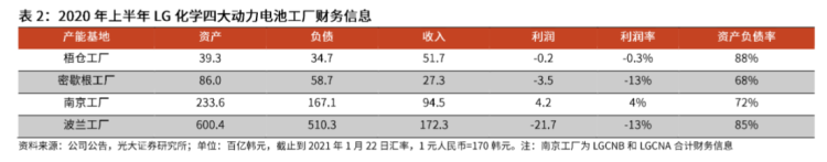 根據(jù)光大證券研究所數(shù)據(jù)顯示,在2020年上半年,LG新能源四大動力電池工廠中,卻只有位于我國南京市的工廠是盈利的。