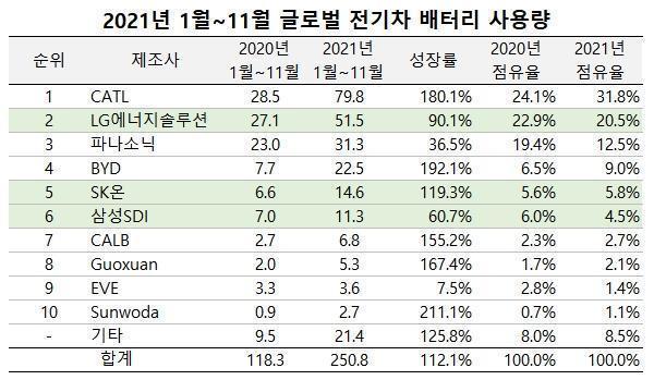 從目前被廣泛引用的SNE調研數(shù)據(jù)來看,寧德時代去年1-11月份的動力電池市場供應79.8GWh,占有率高達31.8%;而LG新能源則為51.5GWh,市占率只有20.5%。這與該機構發(fā)布的Q1的市場占有率并沒有太大的差異。