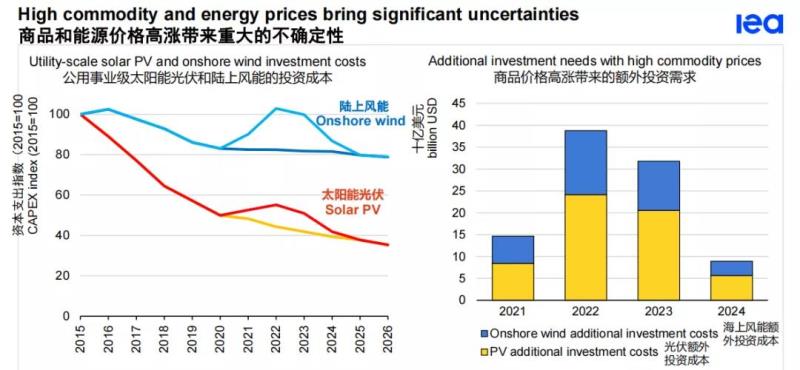 太陽能光伏發(fā)電站和風(fēng)力發(fā)電站的較高價格對預(yù)期設(shè)備價格會持續(xù)下降的贏得競爭性拍賣的開發(fā)商構(gòu)成了特別的挑戰(zhàn)。如果商品價格在2022年之前一直居高不下,那么太陽能三年和風(fēng)能五年的成本降低就會被抹去。增加的成本將需要超過1000億美元的額外投資來安裝相同數(shù)量的容量。 這相當(dāng)于將今天的全球可再生能源發(fā)電能力的年度投資增加約1/3。