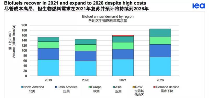 隨著印度和印度尼西亞引領(lǐng)全球生物燃料需求的重新增長,亞洲將超越歐洲。繼去年在全球運(yùn)輸中斷的情況下出現(xiàn)歷史性下降后,生物燃料的總需求將在2021年超過2019年的水平。在我們的主要情形中,全球?qū)ι锶剂系哪晷枨蟮?026年將增長28%,達(dá)到1860億升。美國的產(chǎn)量增長領(lǐng)先,但這一增長大部分是從疫情造成的下降中反彈而來的。