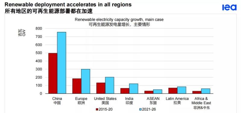 總的來說,中國在未來五年內(nèi)仍然是領(lǐng)導(dǎo)者,占全球可再生能源容量增長的43%,其次是歐洲、美國和印度。僅這四個市場就占了全球可再生能源容量擴(kuò)張的80%。