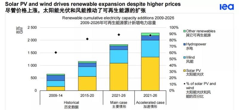 預(yù)計未來五年可再生能源容量的增長將加速,到2026年將占全球電力容量增長的近95%。我們已經(jīng)上調(diào)了一年前的預(yù)測,因為更有力的政策支持和為COP26宣布的雄心勃勃的氣候目標(biāo)超過了目前創(chuàng)紀(jì)錄的商品價格,后者增加了建設(shè)新的風(fēng)能和太陽能光伏設(shè)施的成本。在全球范圍內(nèi),可再生能源發(fā)電量在2020年至2026年期間預(yù)計將增加60%以上,達(dá)到4800萬千瓦以上。這相當(dāng)于目前全球化石燃料和核能發(fā)電量的總和。
