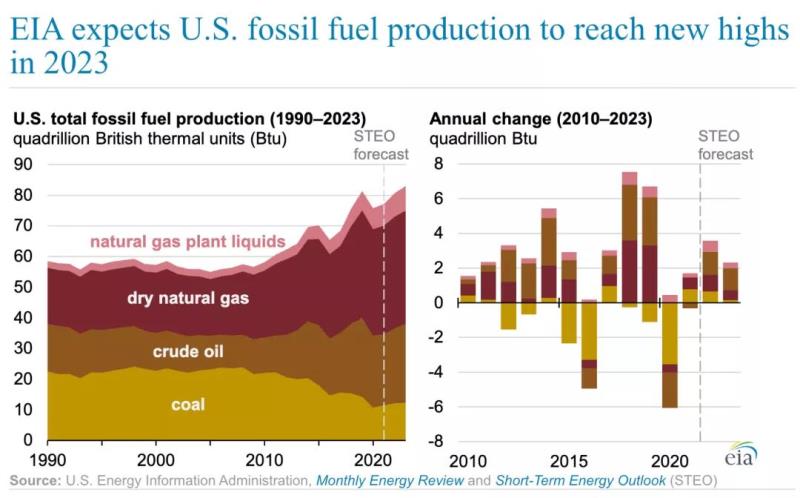 中國儲能網(wǎng)訊:據(jù)美國能源信息署的報告,在 2020 年下降之后,美國化石燃料(包括天然氣、原油和煤炭)的總產(chǎn)量在 2021 年增長了 2%,達到 77.14 萬億英熱單位。預計美國化石燃料產(chǎn)量將在 2022 年和 2023 年繼續(xù)增長,超過 2019 年的產(chǎn)量,并在 2023 年創(chuàng)新紀錄。