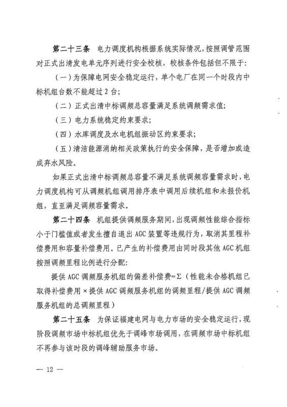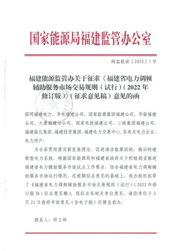 中國儲能網(wǎng)訊:1月21日,福建能監(jiān)辦發(fā)布關(guān)于征求《福建省電力調(diào)頻輔助服務(wù)市場交易規(guī)則(試行)(2022年修訂版)》(征求意見稿)意見的函,修訂版中綜合調(diào)頻性能指標(biāo)不低于0.55,儲能電站可作為調(diào)頻服務(wù)主體,但要求不小于10MW,快速地區(qū)報(bào)價(jià)上限12元/MW,慢速地區(qū)報(bào)價(jià)上限16元/MW。
