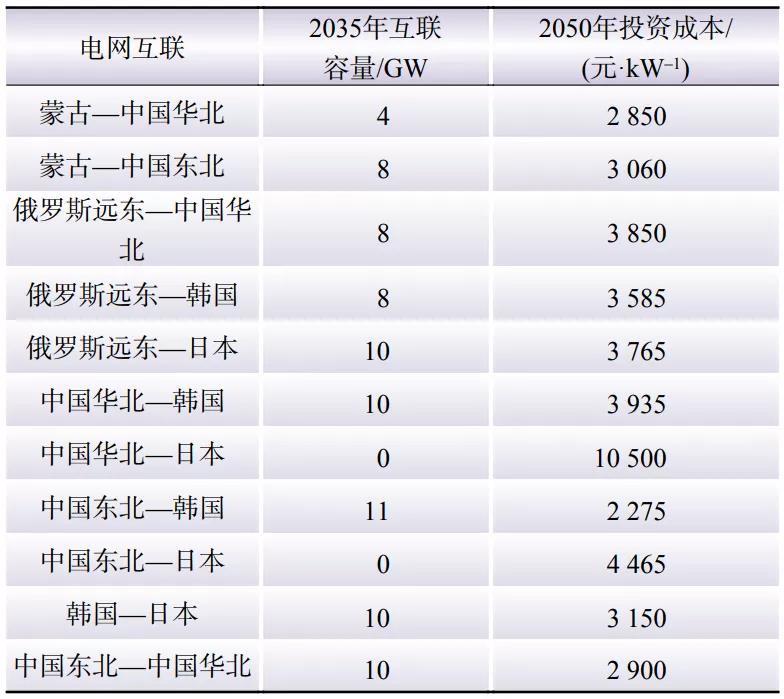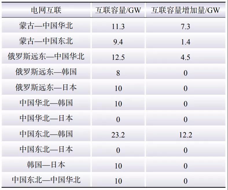 (3)在情景0優(yōu)化結果的基礎上,增加送受端系統(tǒng)之間的電網(wǎng)互聯(lián)容量,作為新的邊界條件,重新優(yōu)化東北亞6區(qū)域的新能源、電網(wǎng)和儲能容量,論述電網(wǎng)互聯(lián)布局和容量規(guī)劃問題,形成情景2。