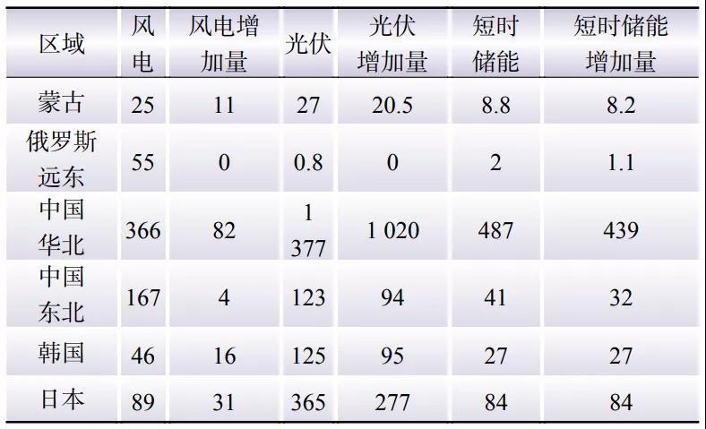 (2)在情景0優(yōu)化結果的基礎上,增加風資源較好區(qū)域風電的裝機容量,作為新的邊界條件,重新優(yōu)化東北亞6區(qū)域的新能源、電網(wǎng)和儲能容量,論述新能源裝機布局和容量規(guī)劃問題,形成情景1。