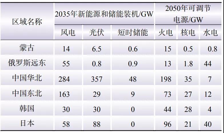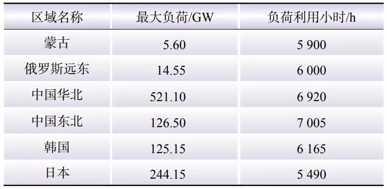 負荷方面,基于東北亞蒙古、俄羅斯遠東、中國華北、中國東北、韓國、日本6大區(qū)域2050年的最大負荷預測(見表1)和歷史負荷特性,得到6大區(qū)域2050年的全年逐小時負荷特性曲線。