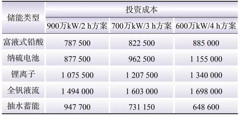 由表9可以看到,由于不同類型的儲能系統(tǒng)的功率成本、能量成本差異較大,造成不同配置方案的投資成本差別較大。對于電化學(xué)儲能系統(tǒng)來說,3種配置方案中,最優(yōu)的為鉛酸電池系統(tǒng)的900萬kW/2 h方案;若地理條件允許,抽水蓄能電站的600萬kW/4 h方案更優(yōu)。