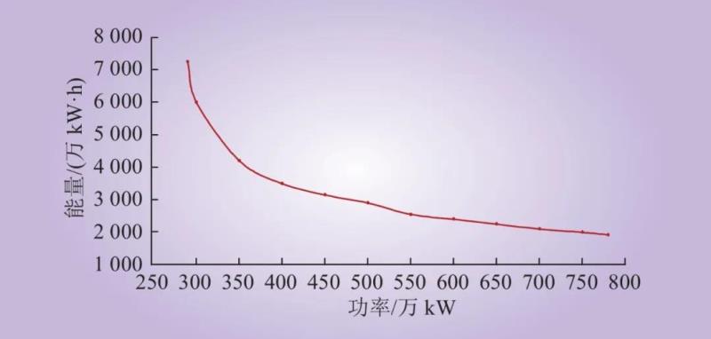 分析解集的規(guī)律,以2021年的計算結(jié)果為例,繪制儲能的功率和能量分析計算結(jié)果,如圖8所示??梢钥吹剑谶_到相同目標的前提下,儲能的能量隨著儲能功率的增加而減少,且減少的趨勢逐步放緩。在功率較小時(初值290萬kW為起點),能量下降斜率較大,當(dāng)功率達到650萬kW以上時,儲能的能量基本達到平穩(wěn)狀態(tài)。
