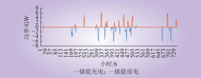 以儲能600萬kW/2 400萬kW·h的配置方案為例,選取典型日繪制系統(tǒng)時序運行曲線和儲能SOC曲線,如圖4、5所示??梢钥吹剑?dāng)SOC達到100%,儲能無法繼續(xù)充電,新能源發(fā)生棄電,直到17:00,新能源發(fā)電功率減小,負荷上升,儲能有了放電空間,SOC開始減小,直到22:00儲能電量放完。圖6、7為2021年1月儲能的SOC曲線和儲能充放電功率曲線。