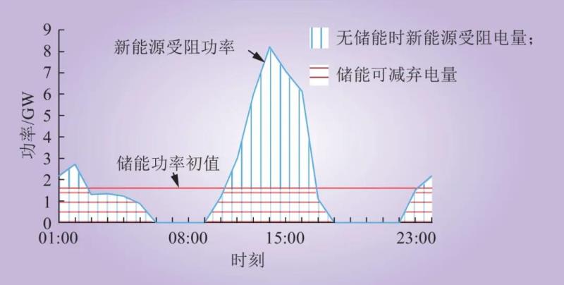 根據(jù)新能源利用率和負荷限電電量要求,結(jié)合儲能充放電策略,計算功率初值對應(yīng)的儲能能量。計算步驟為:①選擇儲能能量初值,可為單次新能源受阻電量和單次負荷限電電量中的最大值;②逐時段計算儲能的充、放電功率。儲能的充放電功率應(yīng)由儲能的荷電狀態(tài)、儲能功率、新能源受阻功率、負荷受限功率及系統(tǒng)允許儲能充放電功率綜合確定;③計算配置儲能后的新能源受阻電量和新能源利用率;④判斷新能源利用率是否滿足要求。新能源利用率小于目標時,增加儲能能量;新能源利用率大于目標時,減少儲能能量,直至滿足新能源利用率目標;判斷平抑的負荷限電電量是否滿足平衡要求,不滿足時,增加儲能能量,直至滿足平衡要求。