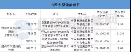 此前在2021年7月-9月,山西就曾有四個400MW/800MWh儲能項目招標,中標均價3.199元/Wh。