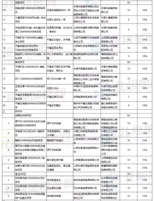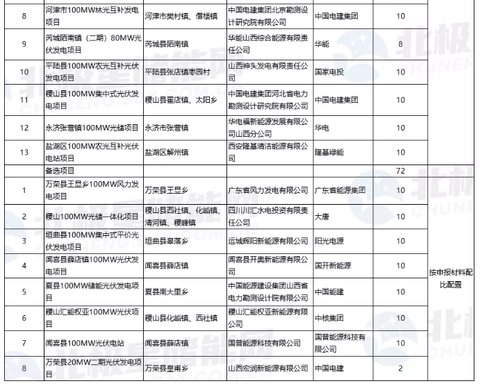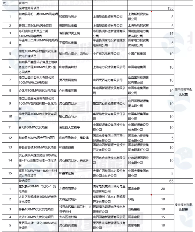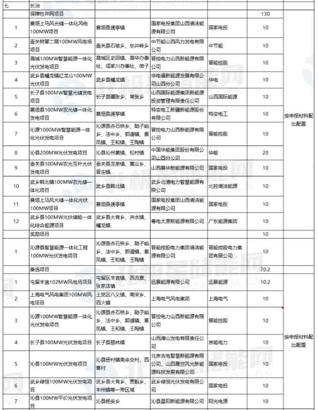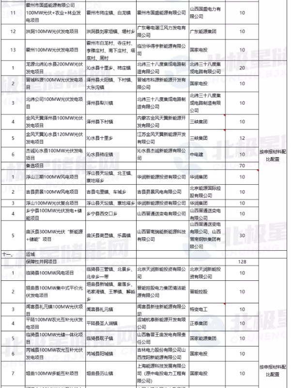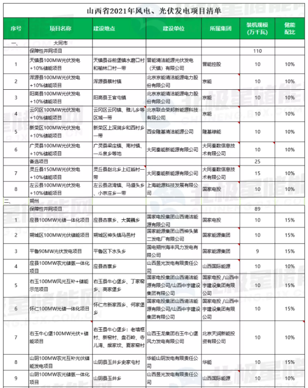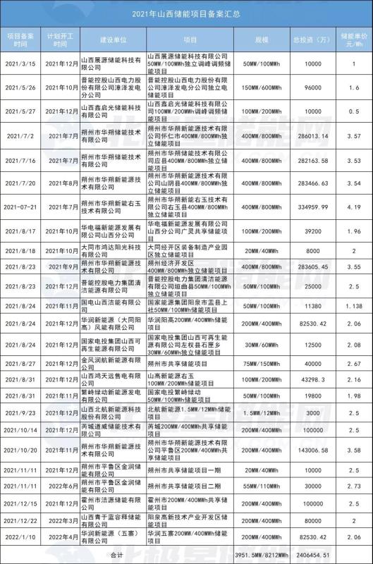 此前2021年10月22日,山西省能源局發(fā)布《關(guān)于下達山西省 2021年風電、光伏發(fā)電保障性并網(wǎng)年度建設(shè)計劃的通》。風、光合計17.792GW,其中保障性11.2GW+獎勵700MW+備選5.892GW,文件項目列表中風電配置10%儲能,光伏配置10%-15%儲能,除了未公布的儲能配比之外,儲能裝機量達469.5MW。由此可見,目前已經(jīng)備案的儲能項目基本上就已經(jīng)滿足了風光發(fā)電項目要求。