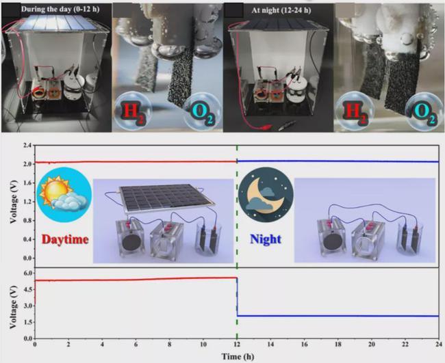 團隊鐘耀棠等構建了一種高效低成本的制氫新體系,該體系由太陽能電池板發(fā)電、可充電鋅-空氣電池儲電和電解槽電解水制氫等三部分構成。制備出能同時適用于氫析出(HER)、氧析出(OER)與氧還原(ORR)反應的非貴金屬催化材料(Co-NC@CC)。實驗結果表明,所構建的電解水制氫系統(tǒng)可實現(xiàn)24 h無間斷高效穩(wěn)定制氫。在氙燈1500 W/m2光功率密度的照射下,其太陽能-氫轉化效率(STH,solar to H2)高達18.43%,接近低成本吸光材料驅動電解水產氫體系的最高紀錄(18.7%)。這種利用太陽能驅動的新型高效低成本電解水制氫系統(tǒng)實現(xiàn)了氫能生產清潔化,為制氫技術的可持續(xù)發(fā)展提供了可靠途徑。成果” Efficient water splitting system enabled by multifunctional platinum-free electrocatalysts”發(fā)表在Adv. Funct. Mater. 2021, 31, 2009853上。