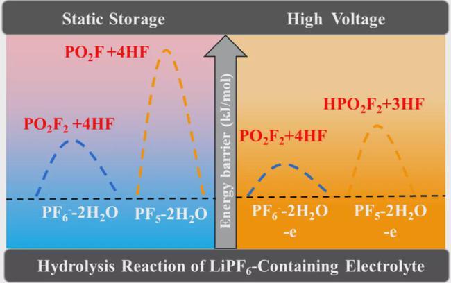 團隊邢麗丹教授、劉明珠等提出了鋰離子電池中氫氟酸(HF)產生的新機理。在鋰離子電池的使用過程中,含有LiPF6的電解液會發(fā)生水解反應,產生HF。HF會進一步腐蝕電極/電解液界面膜,進而導致電池性能下降。然而,商用電解液的水解機理并不明確,導致抑制電解液水解的研究進展緩慢。該團隊利用分子動力學模擬,量子化學計算和實驗研究相結合,闡明了電解液的水解機制,并提出了抑制水解反應的解決方案。該成果“Hydrolysis of LiPF6?Containing Electrolyte at High Voltage” 發(fā)表在ACS Energy Lett. 2021, 6, 2096-2102上。