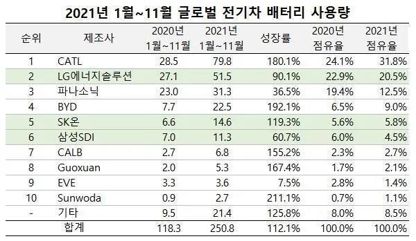 2021年1~11月全球動力電池裝機量排行榜